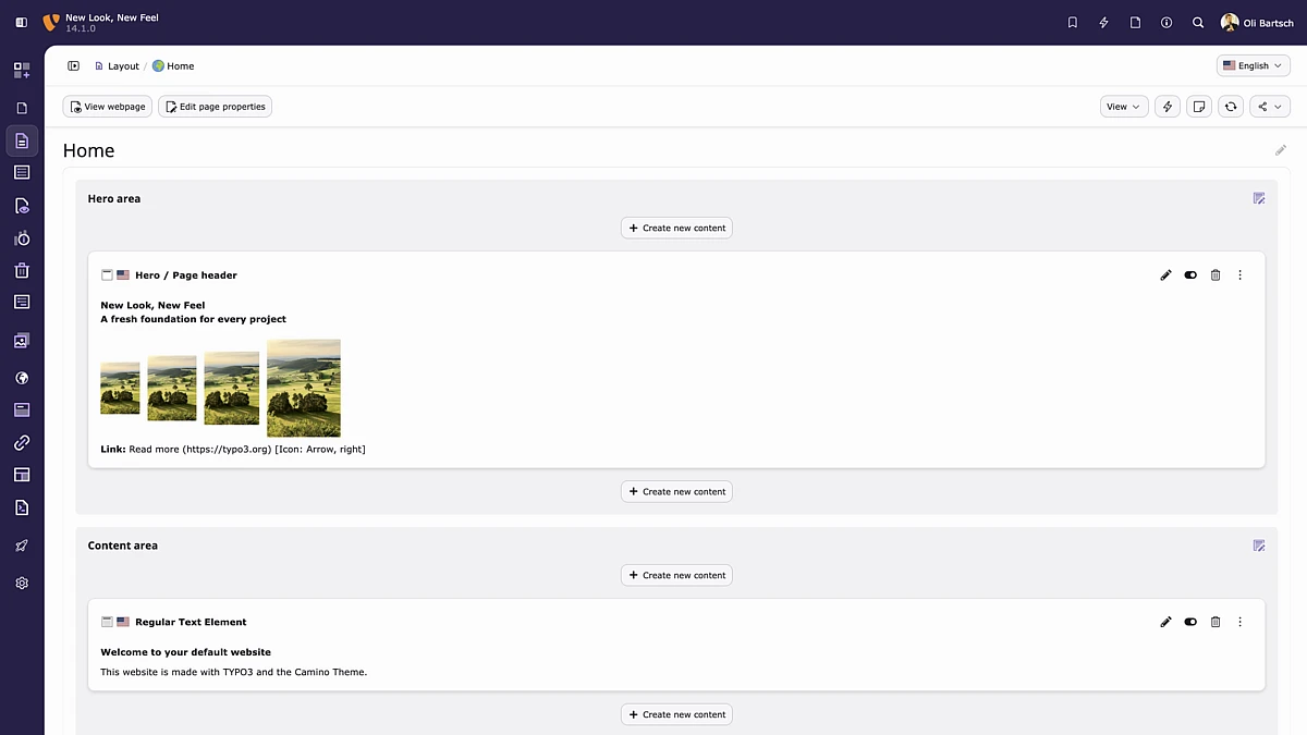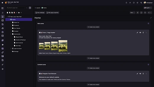 TYPO3 v14.1 introduces a ready-to-use default theme that enables you to launch new websites in minutes. The theme is fully self-contained, requires no third-party extensions, and showcases TYPO3’s standard page structure and content elements.