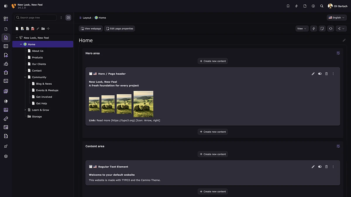 With TYPO3 v14.1, a ready-to-use default theme called Camino is now included, enabling integrators to launch new websites within minutes. The theme is fully self-contained, free of third-party dependencies, and showcases TYPO3’s standard page structure and content elements that don’t depend on Fluid Styled Content. It also offers straightforward customization options, such as multiple color schemes and configurable navigation and footer layouts.