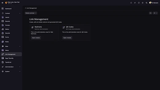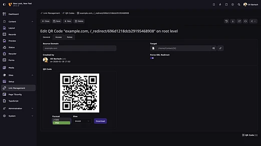 Beyond additional backend UI refinements, the sprint release also delivers a new backend module that allows editors to generate QR codes directly within the backend and link them to pages. With permanent URLs behind each code, this feature is particularly well suited for use with print materials.