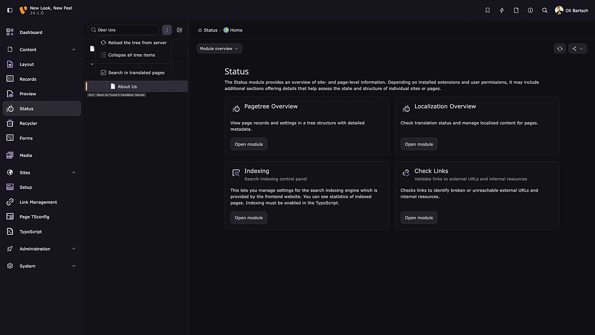 In multilingual TYPO3 installations, editors can now quickly search for pages using translated titles or translation UIDs. Visual labels highlight how each result matches the search, making it easier and more intuitive to navigate large and complex page trees.