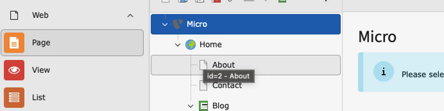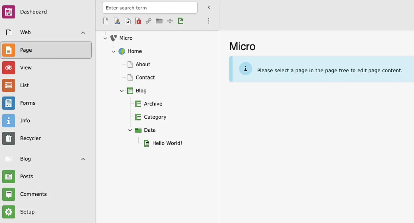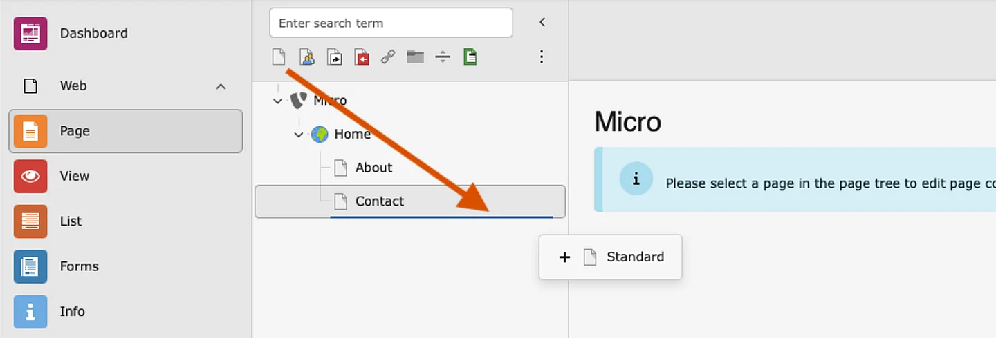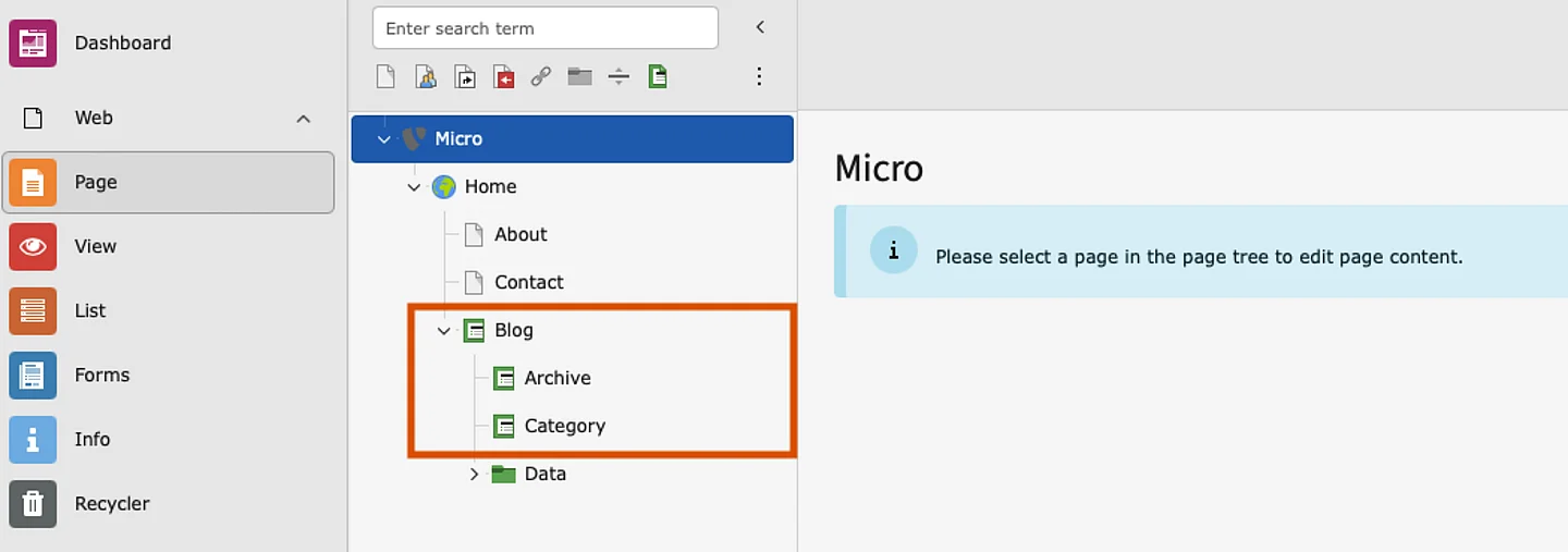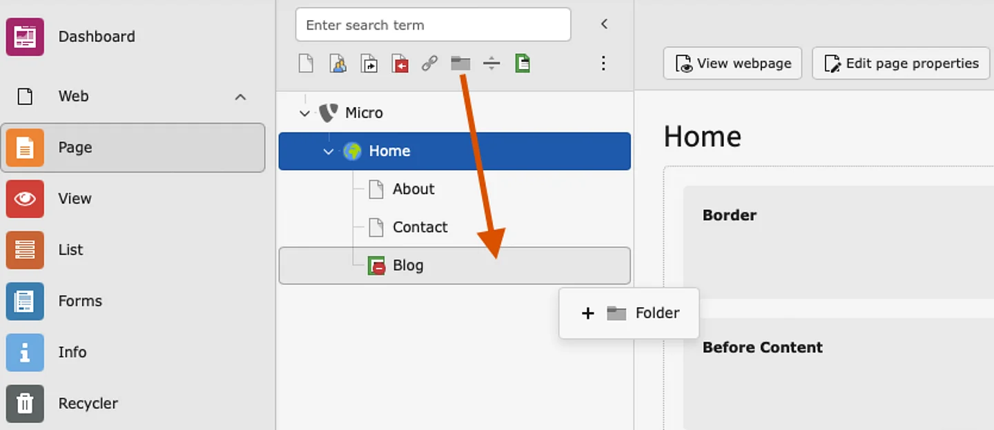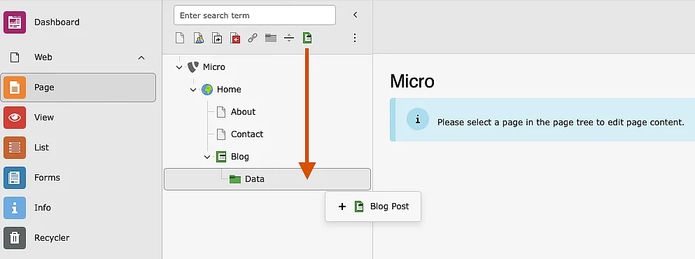 To create a page, go to the page tree and drag the page icon to the page tree and give it a name (Blog).