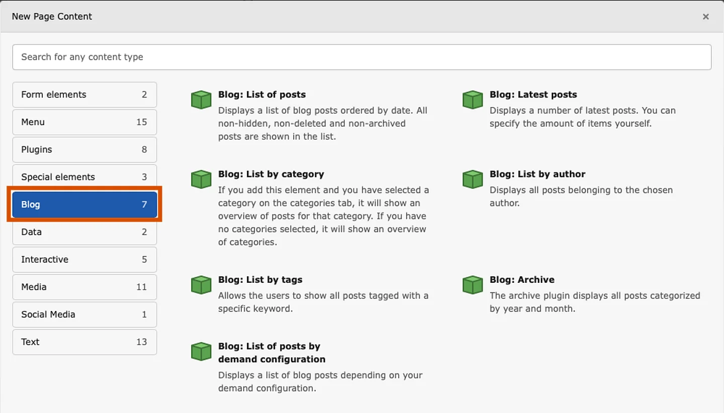 We are now ready to start displaying blog entries in the front end of our site. TYPO3 extensions, like the Blog Extension often contain a number of different plugins that perform specific tasks.