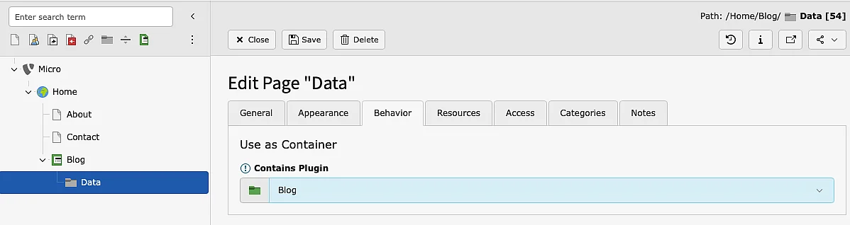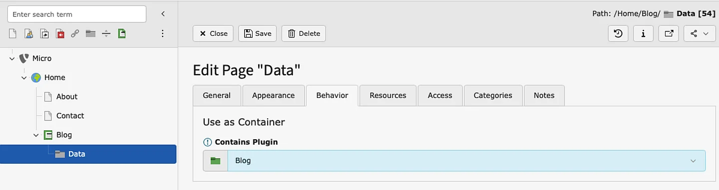 Want to make the folder icon green? Blog > Edit Page Properties > Behaviour > Contains Plugin > Blog.