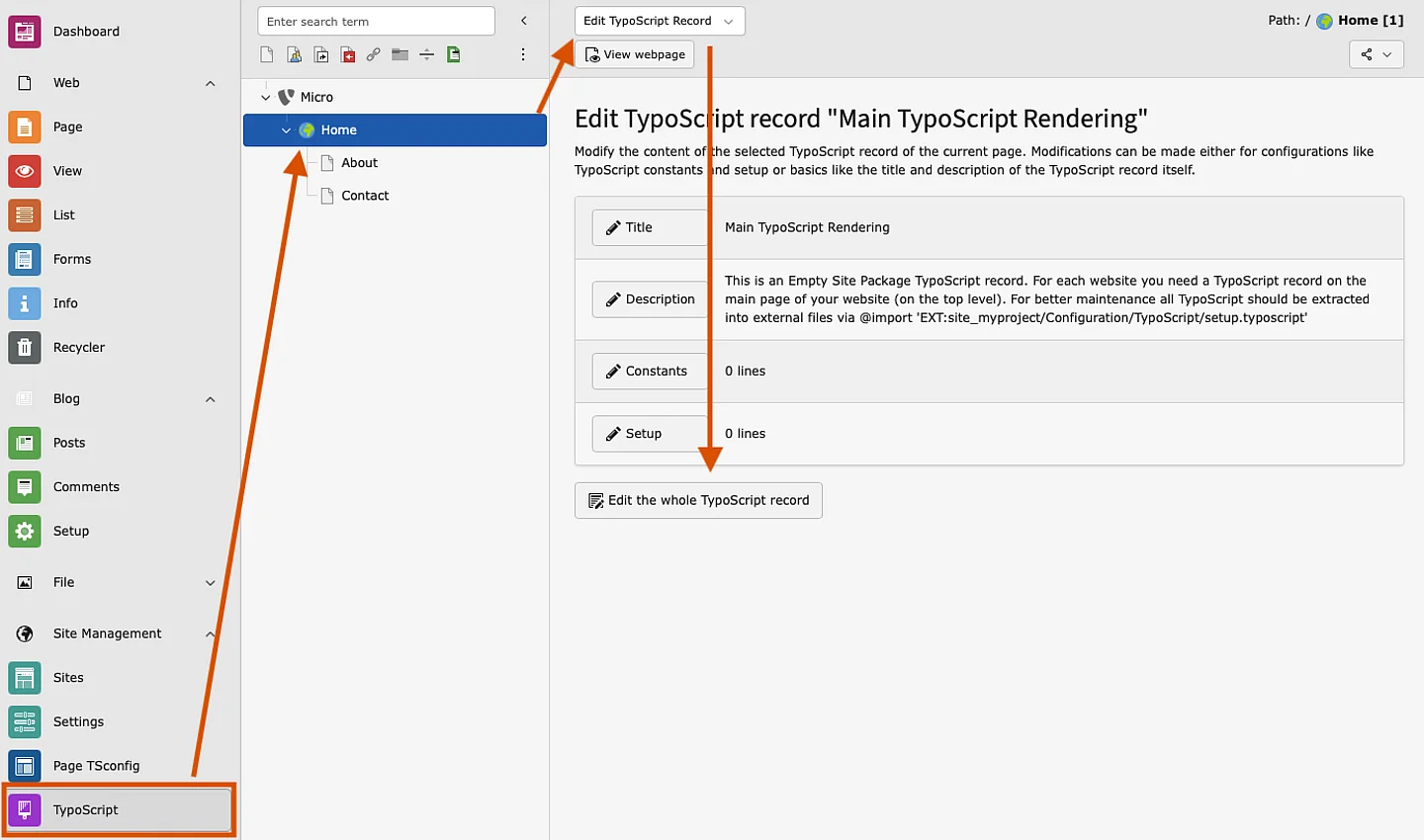 TypoScript > Root Page > Edit TypoScript Record > Edit the whole TypoScript record
