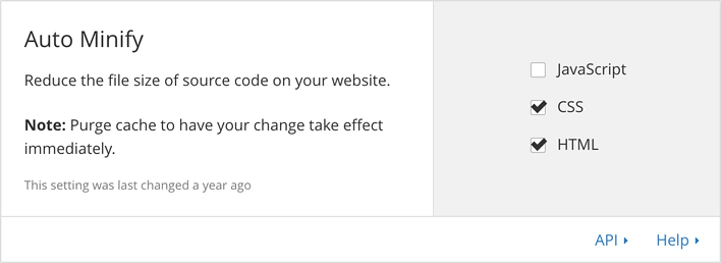 Cloudflare provides a few interesting options for speeding up websites. Today, the average web page has more than 85 objects (images, JavaScript, CSS, etc.) that make up more than 750 KB of data. All that data needs to be downloaded when a page loads but since Cloudflare network acts as a proxy with your web server, they may optimize the data on-the-fly without any change to your code. One of the options is automatically minifying JavaScript, CSS and HTML whichmay be enabled by simply ticking a few checkboxes: