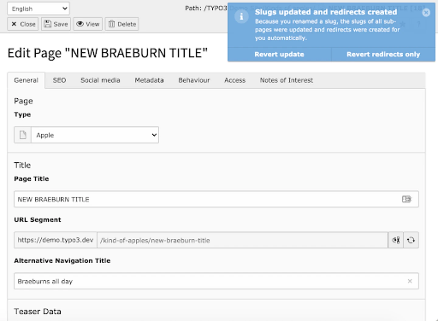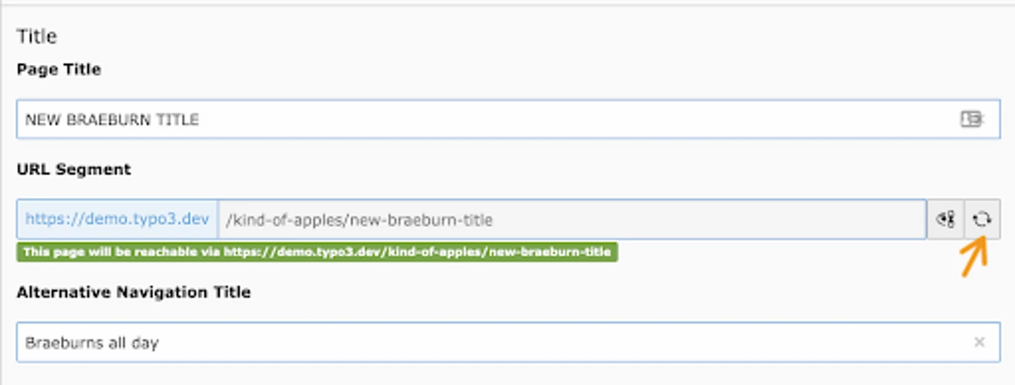 When you update a page’s title, you can also click on the refresh icon under the URL segment to update the link accordingly. In the latest versions of TYPO3, slugs get updated and redirects are created automatically (including those of subpages).