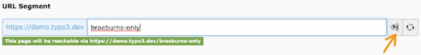 With TYPO3, you can also create readable URLs. Click on the icon closest to the URL segment in the “General” tab in the page editing UI to edit the default URL provided by the TYPO3 page structure.