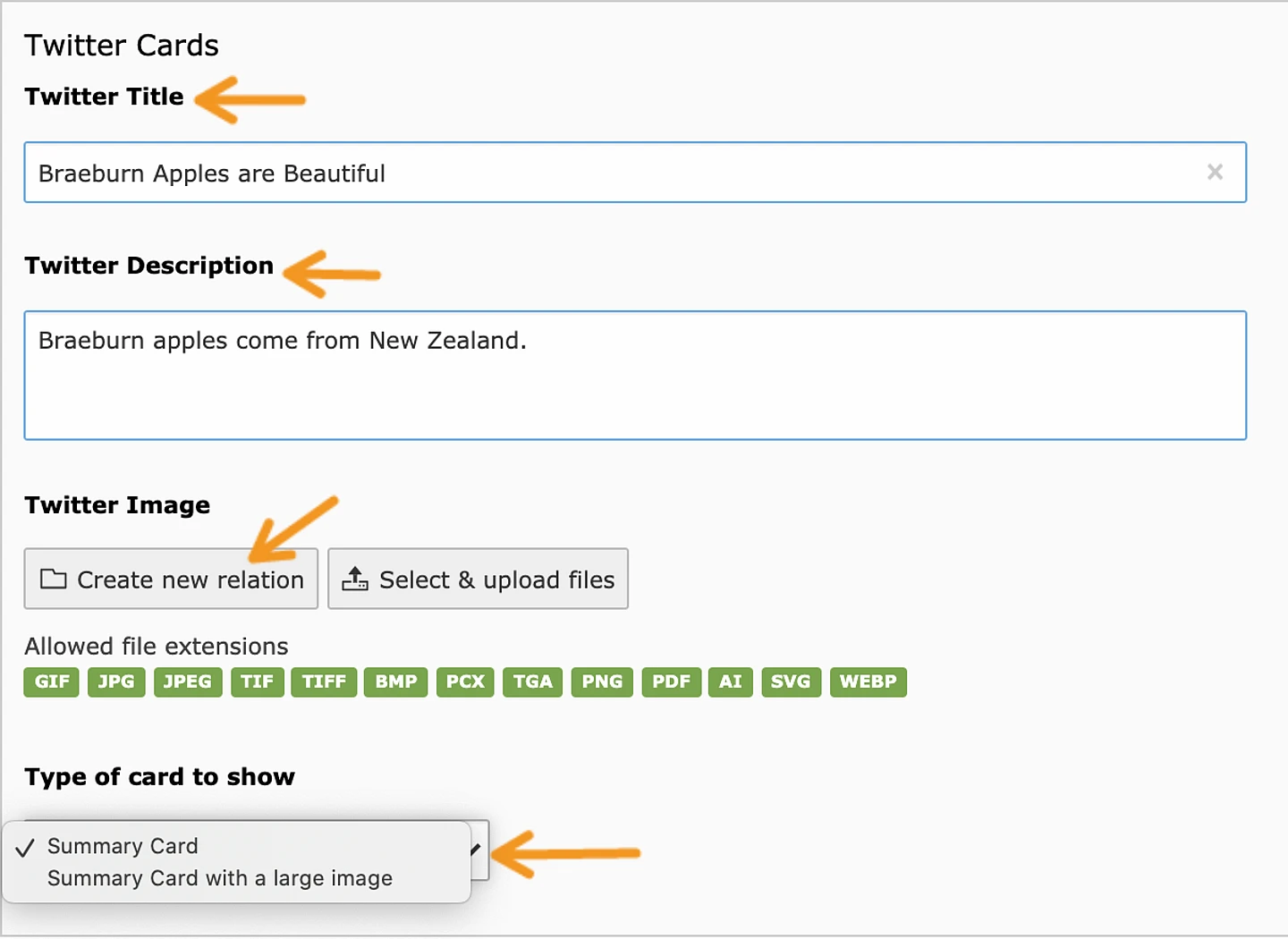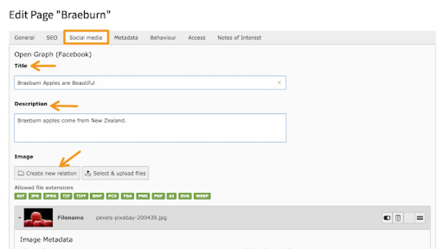 You can also set how your page will show up on Twitter and Facebook when their users post a link to their site. Visit the “Social media” tab in the Page Editing UI where you can set the following details for Facebook’s Open Graph (Facebook’s crawler) and Twitter Cards. Both platforms ask for the following: