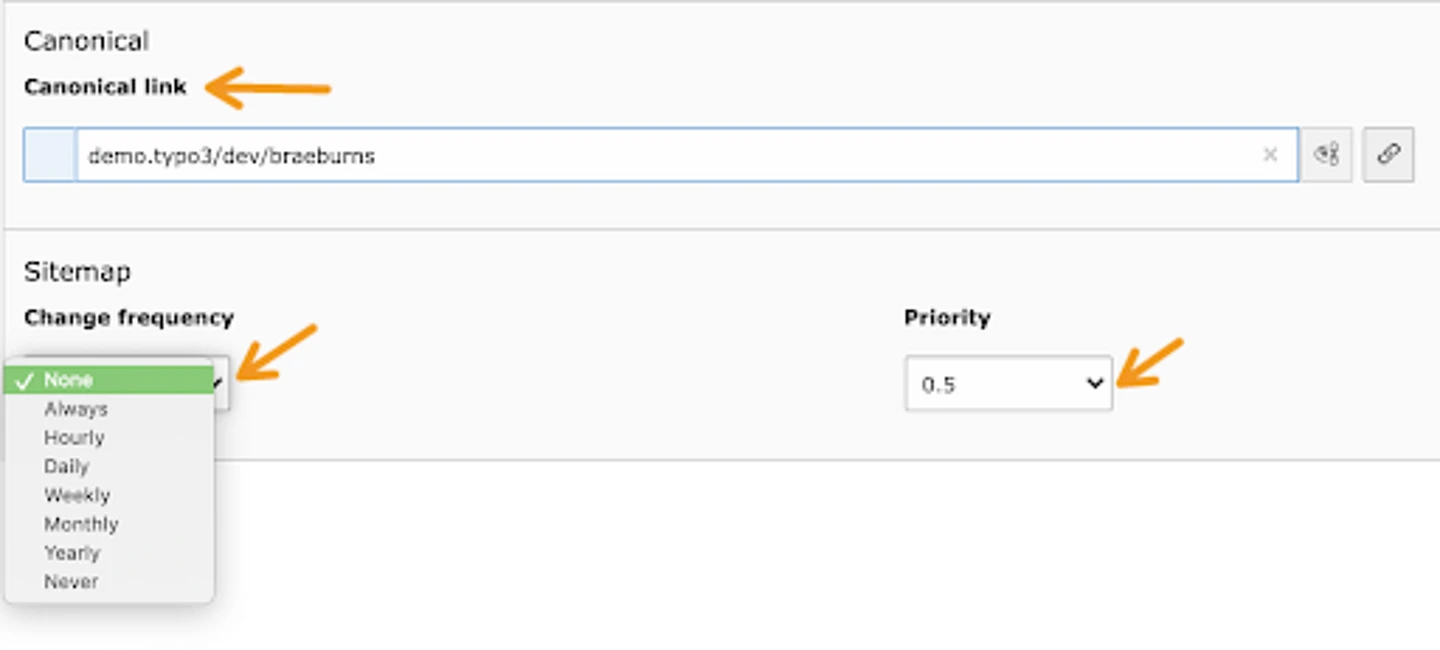 TYPO3 also lets you set a “Canonical link” for a webpage. Canonical links help you distinguish between pages with duplicate or similar content. You’d want to set the canonical URL as the URL of the page that is the “most representative from a set of duplicate pages on your site,” according to Google.