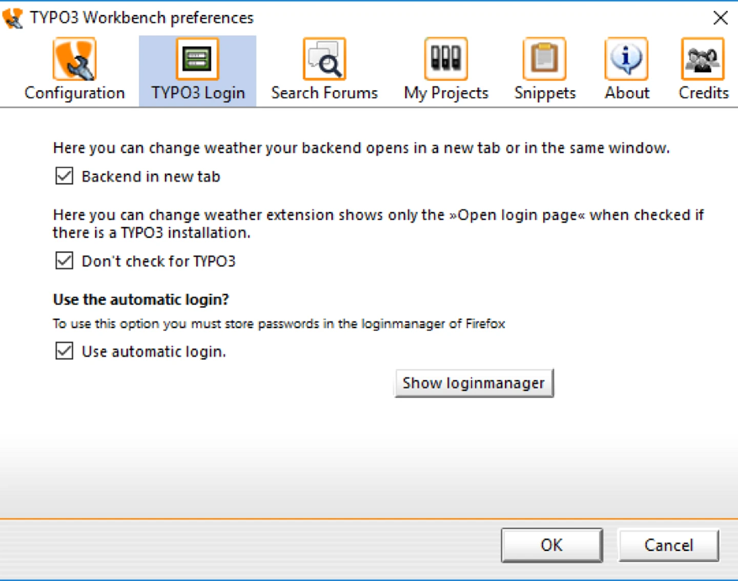 First of all you can switch to the TYPO3 backend from the website with a simple click. By using the login-manager of Firefox it is also possible to automatically log into the backend.