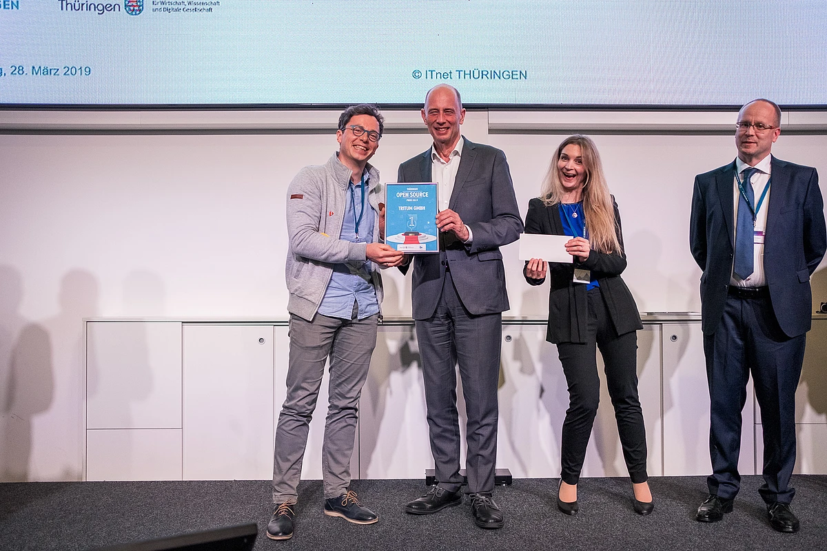 TRITUM is proud winner of the Thuringian Open Source Prize 2019, firstly awarded by ITnet Thüringen in the scope of IT-Exhibition in Erfurt. Our CTO Björn Jacob happily received the certificate from Thuringia’s economy minister Wolfgang Tiefensee on March 28, 2019. Additionally we received a monetary prize money of 7,500€ which directly funds further Open Source engagement of our team.