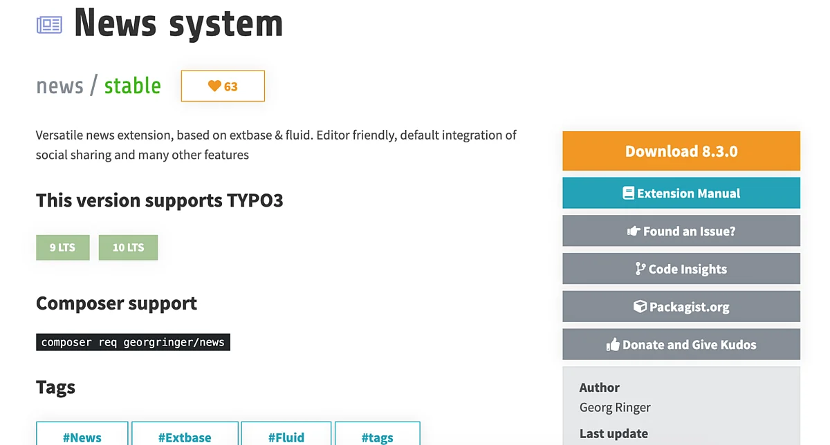 What’s the most popular extension for TYPO3? Probably the News extension, maintained by Georg Ringer. If you need any kind of periodical content like articles, this is a good place to start. On this extension page, you can see that it has its own independent version, the author is the maintainer, it shows when it was last updated, and which versions of TYPO3 it supports.
