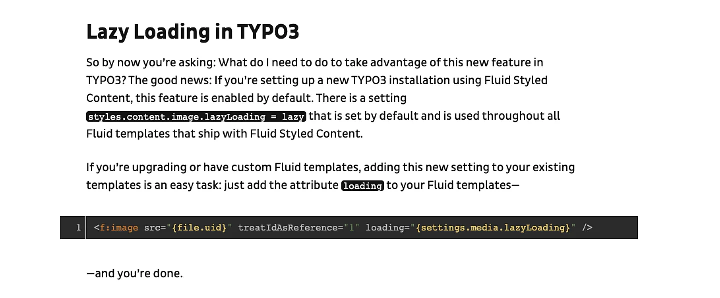 TYPO3 has extensive support for media management, including image editing, setting focal points, etc. Martin Alker from Punkt.de gives an overview of responsive image rendering in TYPO3. TYPO3 v10 LTS was “the first major Content Management System that supports the native HTML implementation of lazy loading out of the box,” writes b13.