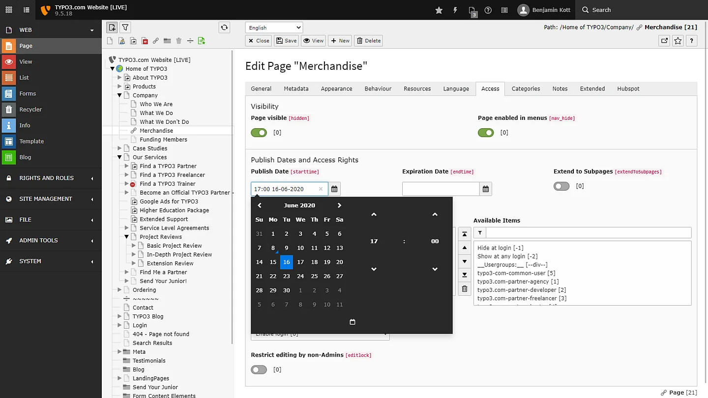 TYPO3 gives editorial teams a focused workspace. Administrators can give editors access to precisely what they need to focus and deliver their work, without the distractions of irrelevant functionality; for example, limit or provide specific access to control: