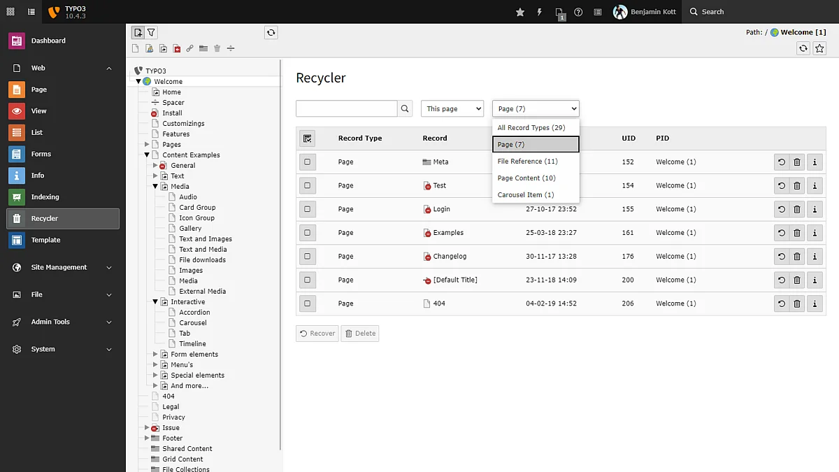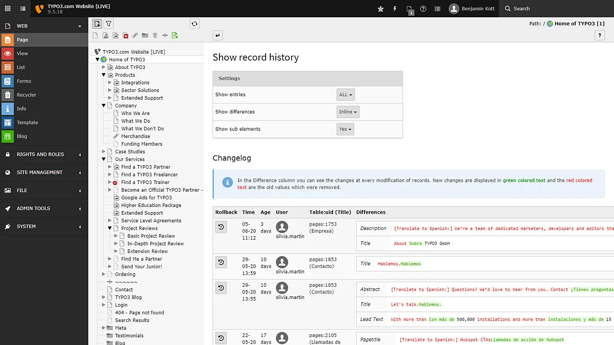 Restore deleted content and revert changes. If you ever need to undo any changes, the context menu of every item in the page-tree includes its history in a “Changelog” and the option to rollback changes.