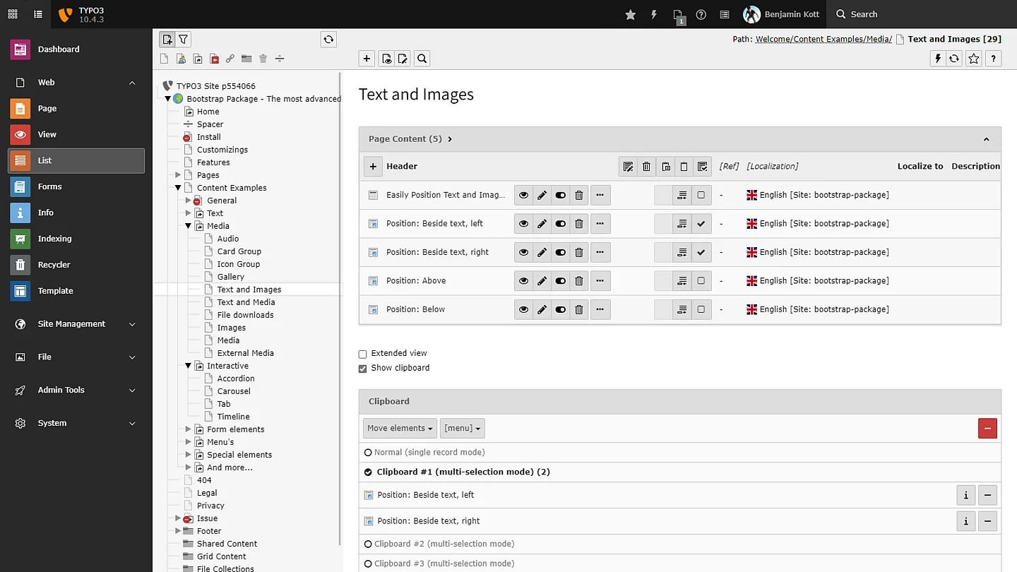 Not everything is easily managed in a page tree. The TYPO3 core list module gives content editors the ability to browse, copy, and bulk-edit content across the site.
