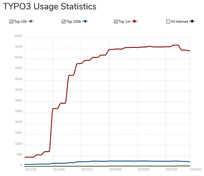 Any major (LTS, Long Term Support) version is supported by the community for three years, and the TYPO3 Project offers a commercial ELTS (Extended Long Term Support) program, extending the legally-compliant supported life of any major version to six years. The result is that TYPO3 is one of the most up-to-date CMSs on the web. Although the number of instances is increasing, it dropped off the list of infected, unmaintained platforms in 2018: