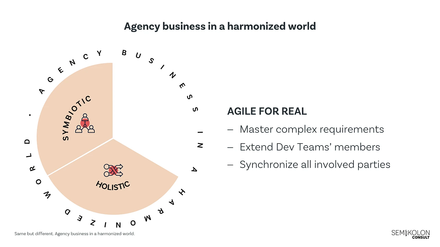 This is all well and good, but how can agencies reach and sustain this state of connectivity and flexibility? Steffen and Kathrin presented a plan for advertising or digital agencies that relies on three fundamental pillars.