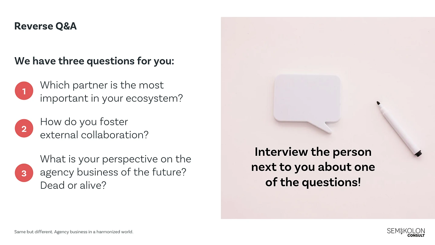 But stop for a moment. If reading this makes you think the talk was negative and all about the impending Death of Agencies, this is the point where Steffen and Kathrin changed the perspective. Their business, Semikolon Consult, is built around the semicolon, symbolizing that “stories don’t just end.” The end of one thing is the start of something new. And that’s good news. The party isn’t over!