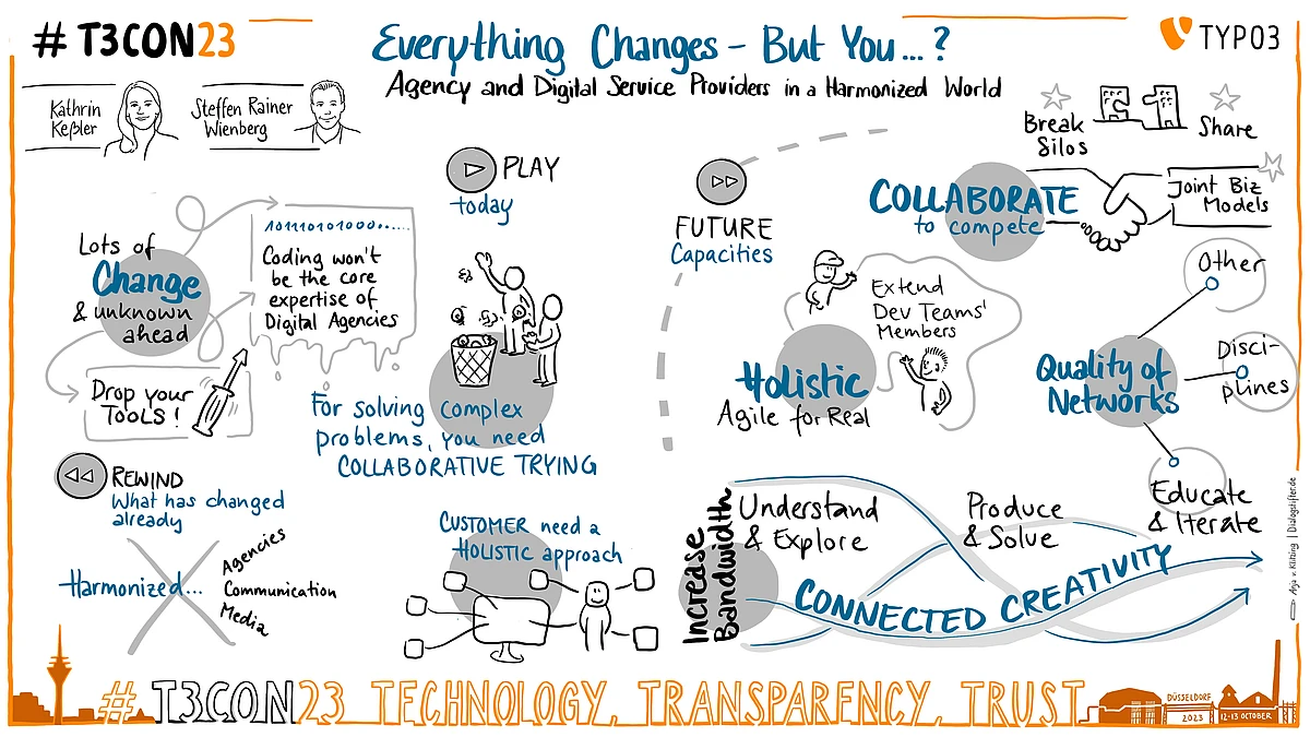 In their T3CON23 talk Everything Changes – But You …?, marketing and business strategy experts Steffen Rainer Wienberg and Kathrin Keßler looked at the options for digital agencies in an increasingly complex and competitive world. After discussing the disruptions that advertising agencies and digital agencies have had to deal with since the eighties, Steffen and Kathrin presented a three-pillar framework for ongoing agency success. They said agencies need to join forces and develop interdisciplinary skills to master complexity.