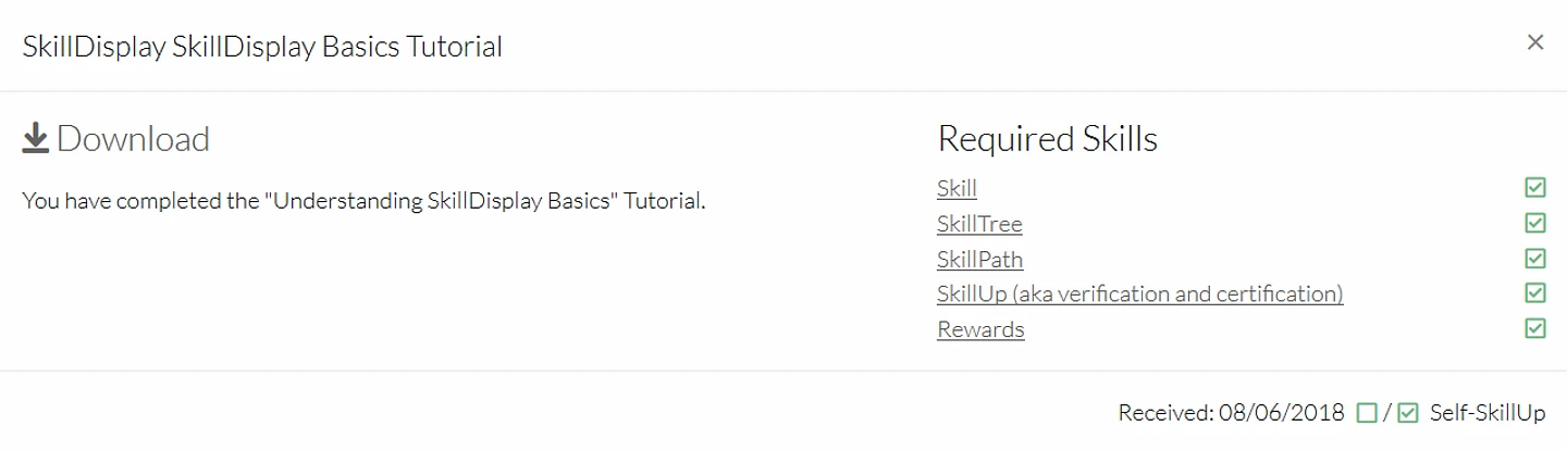 For demonstration purposes, we have created a SkillDisplay reward that you can see in “Available Rewards” in your overview for ones that you have not yet achieved. One of the skills you have to reach to get this reward is called “Rewards”. So it’s kind of like learning how SkillDisplay works by using the platform. The tutorial will help you understand the SkillDisplay platform better! After getting all Self-SkillUps, you receive a “Self-Verification SkillCharta” as a reward, which you can download in the overview.