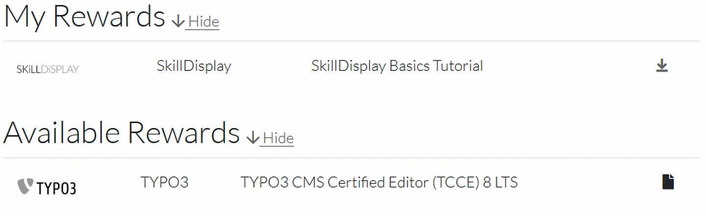 The rest of the blogpost is all about how you can learn, track and verify skills for the certification and how you can register for the official exam. After you have achieved the certificate, you can add the status to the SkillDisplay platform. In the picture below you can see a part of the overview of the available TCCE reward which you get when you pass the TCCE 8 LTS certificate. The reward you get is a guide, which explains how you can share your skills and it’s created by the TYPO3 Education Committee.