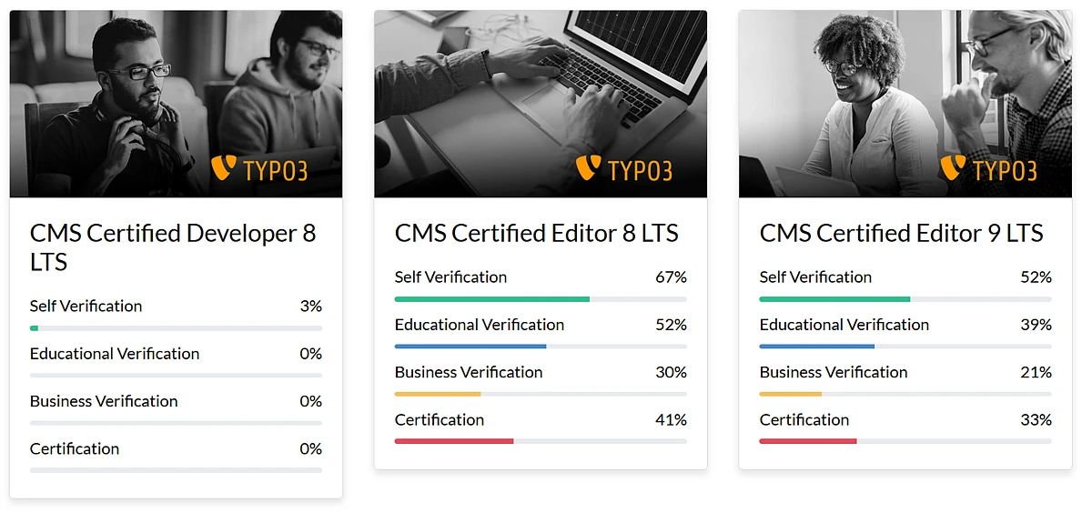 TYPO3 is not only a potential use case, it has already found its application. The TYPO3 Certificates TCCE v7, v8, v9, TCCI v8 and TCCD v8 have already been created with the help of SkillDisplay. At the beginning, the certification syllabus was created and the SkillTree has been adapted to the syllabus. After a while, that process changed, so now the SkillTree is created first and the syllabus can be easily rendered as a list of skills.