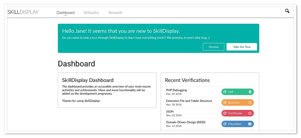 To make life easier for our users, we will create a dashboard with recently verified skills and skills you can verify next. Statistics are planned, as well as an overview of rewards. Everything will be summarized in one place and there will be a tour through the platform.