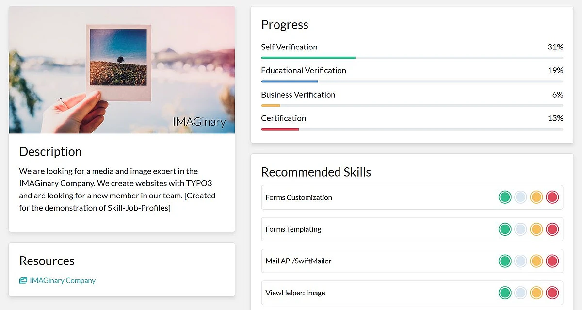 Are you looking for a new employee that has a set of skills you require? The more specific your job profile is, the better you can find a person who suits the job you offer. By already displaying the skills of TYPO3 editors, integrators and developers on the SkillDisplay platform, we were thinking about what functionality we can add to support you and your TYPO3 journey and therefore decided to make it possible to export job profiles with skills you choose.