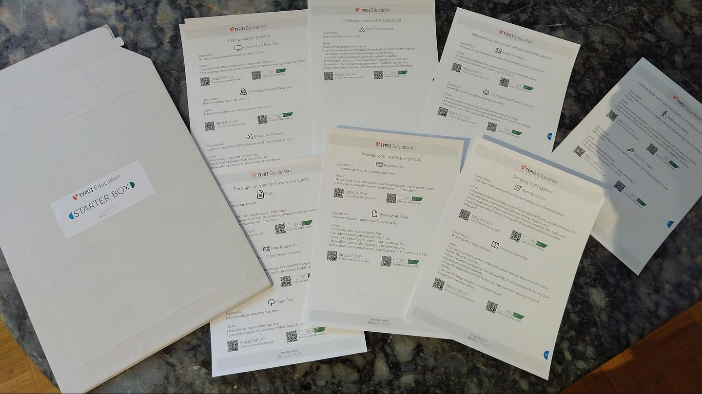 Five different boxes are created by the TYPO3 Education Committee – and empowered by SkillDisplay – that contain educational content for the first 19 skills of the TYPO3 Editor SkillPath. The LectureSheets, BusinessSheets and SkillSheets in the boxes should help: