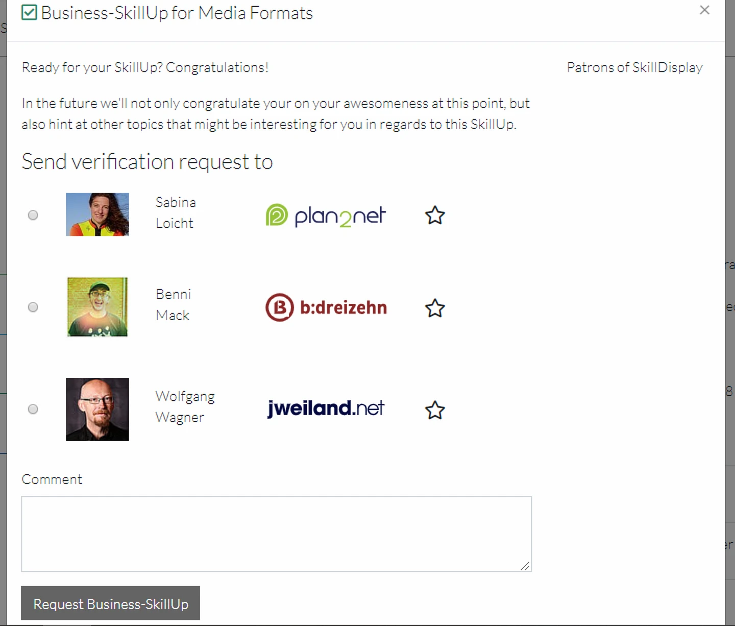 The business SkillUp – which is one of four ways to verify learners’ skills – has the requirement to partner with us. The skills you are able to verify depend on the partnership. If you are a business person who can verify the TYPO3 CMS Certified Editor (TCCE) SkillPath, learners can send you a SkillUp request for each skill of the TCCE SkillPath.