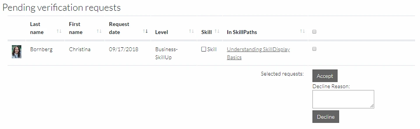 You can either accept or decline the request from the learner. All pending verification requests and completed verifications are listed in the “Verification tools”. It is strongly recommended to only accept requests if you know that the learner really fulfils the goals of the skill.