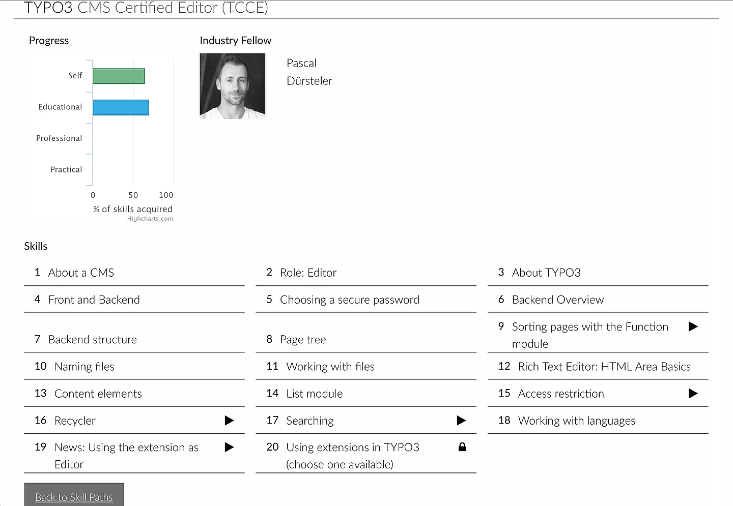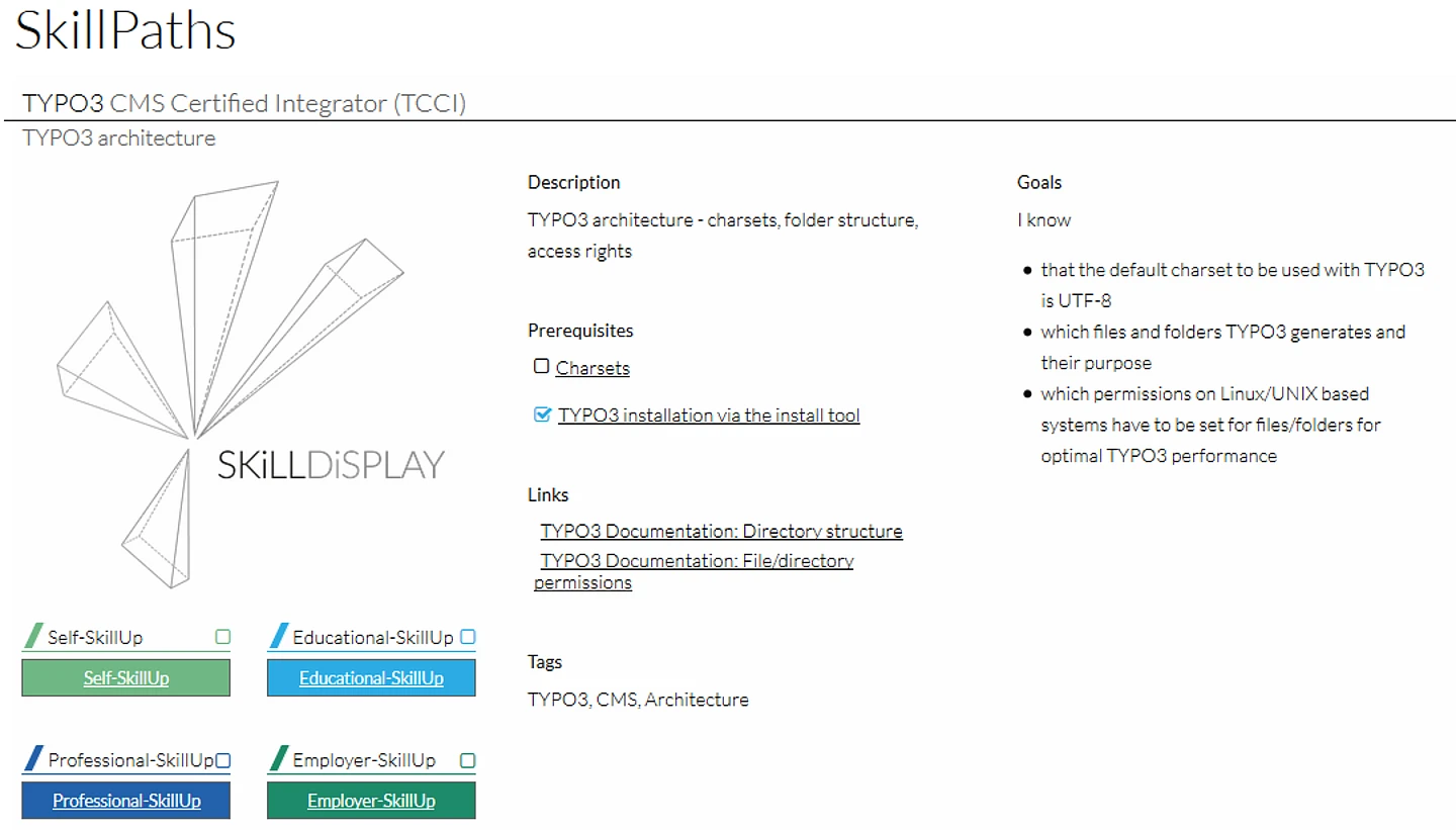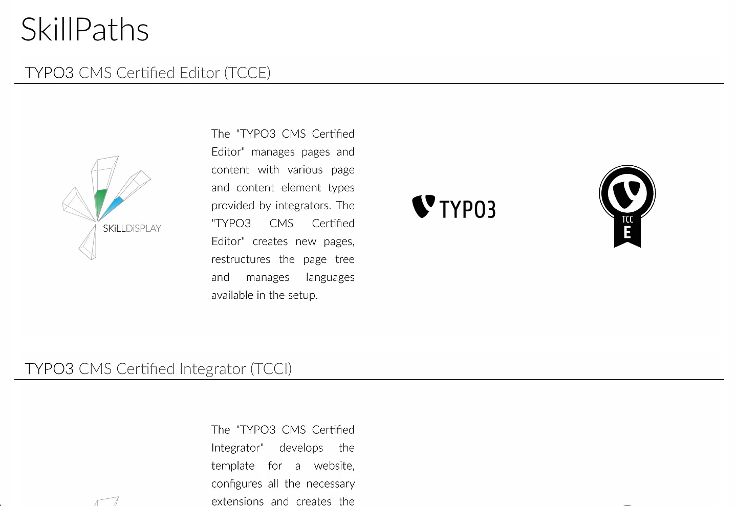 SkillDisplay provides some pre-built learning paths for TYPO3 users like “TYPO3 CMS Certified Editor (TCCE)”, “TYPO3 CMS Certified Integrator (TCCI)”, “TYPO3 FLUID Basics: Standalone” and “TYPO3 FLUID Basics: TYPO3 Edition”. These should help you improving your TYPO3 skills and for those who like to proof their abilities it helps preparing for some certificates.