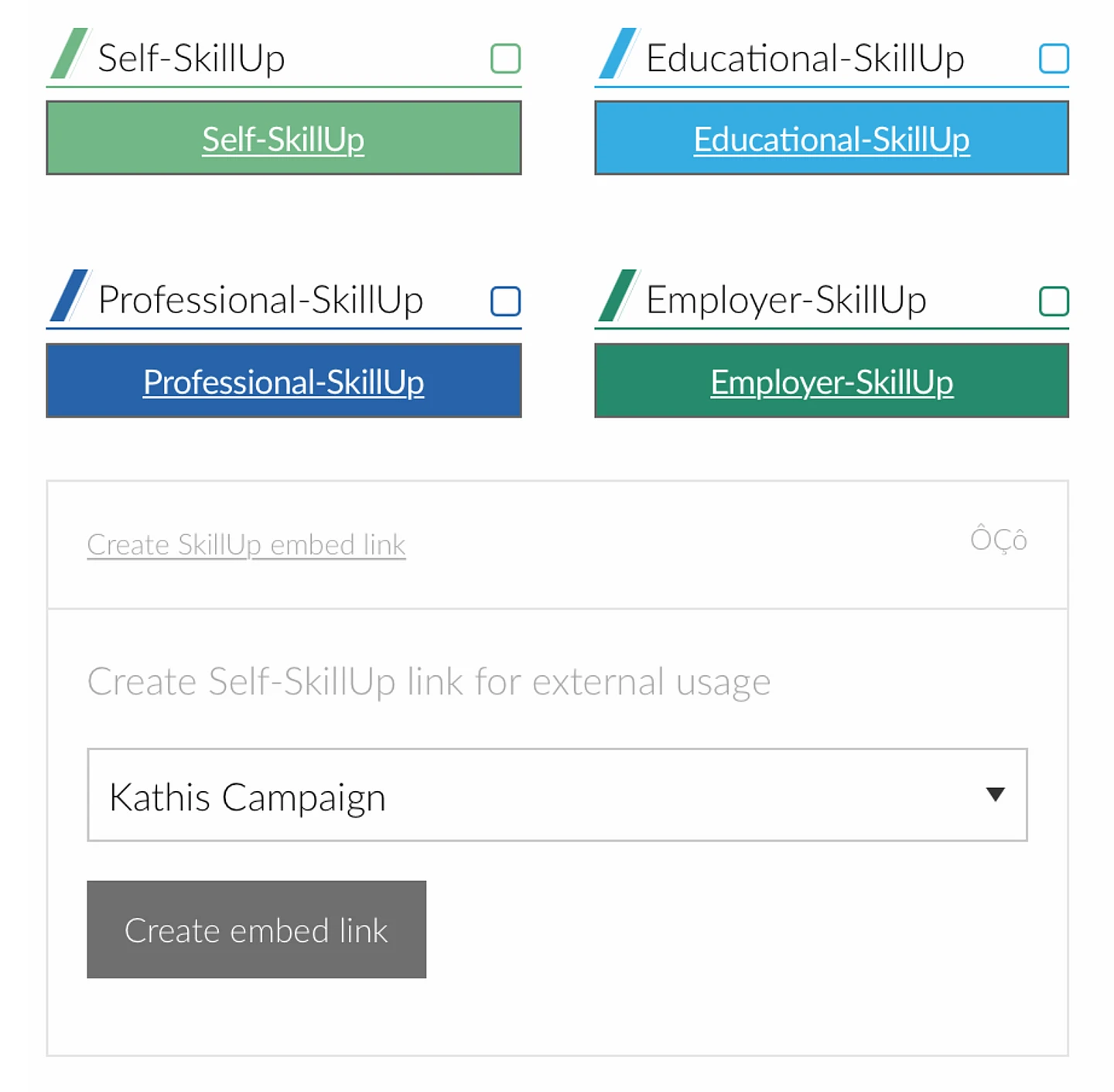 To embed a SkillUp-Button you have to contact the SkillDisplay team. You’ll then get part of a campaign and accordingly have the possibility to generate a link at each single view of a skill. Now you can create a button with this link on your website so others have the ability to give themselves a SkillUp when they visit it.
