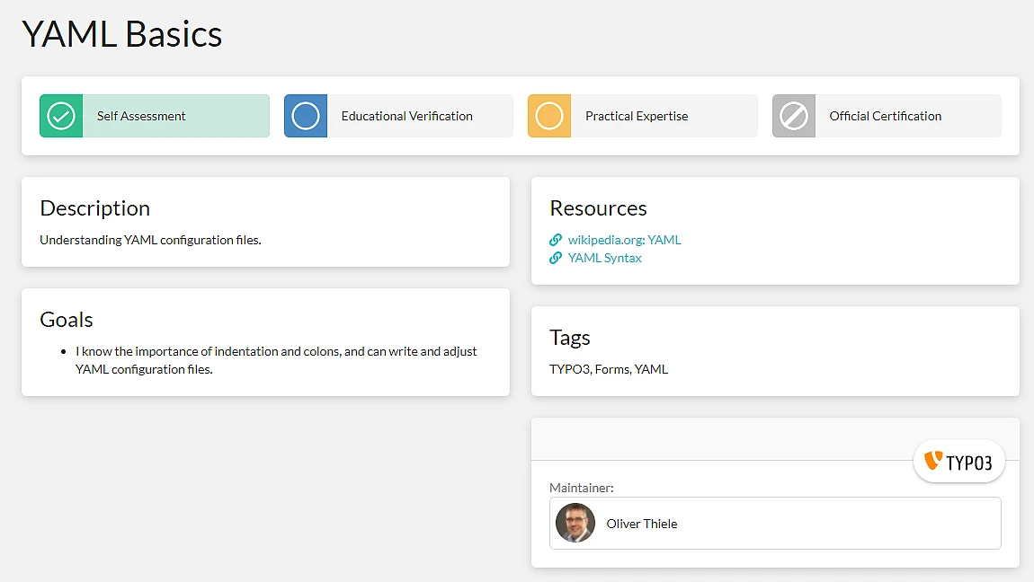 In case of a hopeful TYPO3 integrator, a non-descript “YAML” reference on the CV can be turned into the clearly defined Skill “YAML Basics” as part of the TYPO3 CMS Certified Integrator. Suddenly you and your employee both share the same concept and understanding of what knowledge about YAML in your context actually means: by underlying a concise description, clearly defined learning goals, and referenced resources.