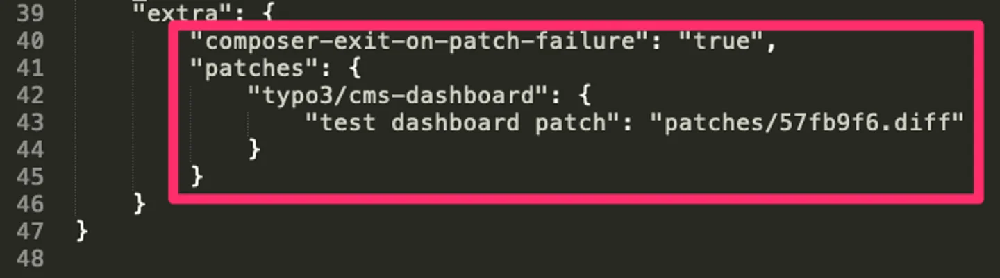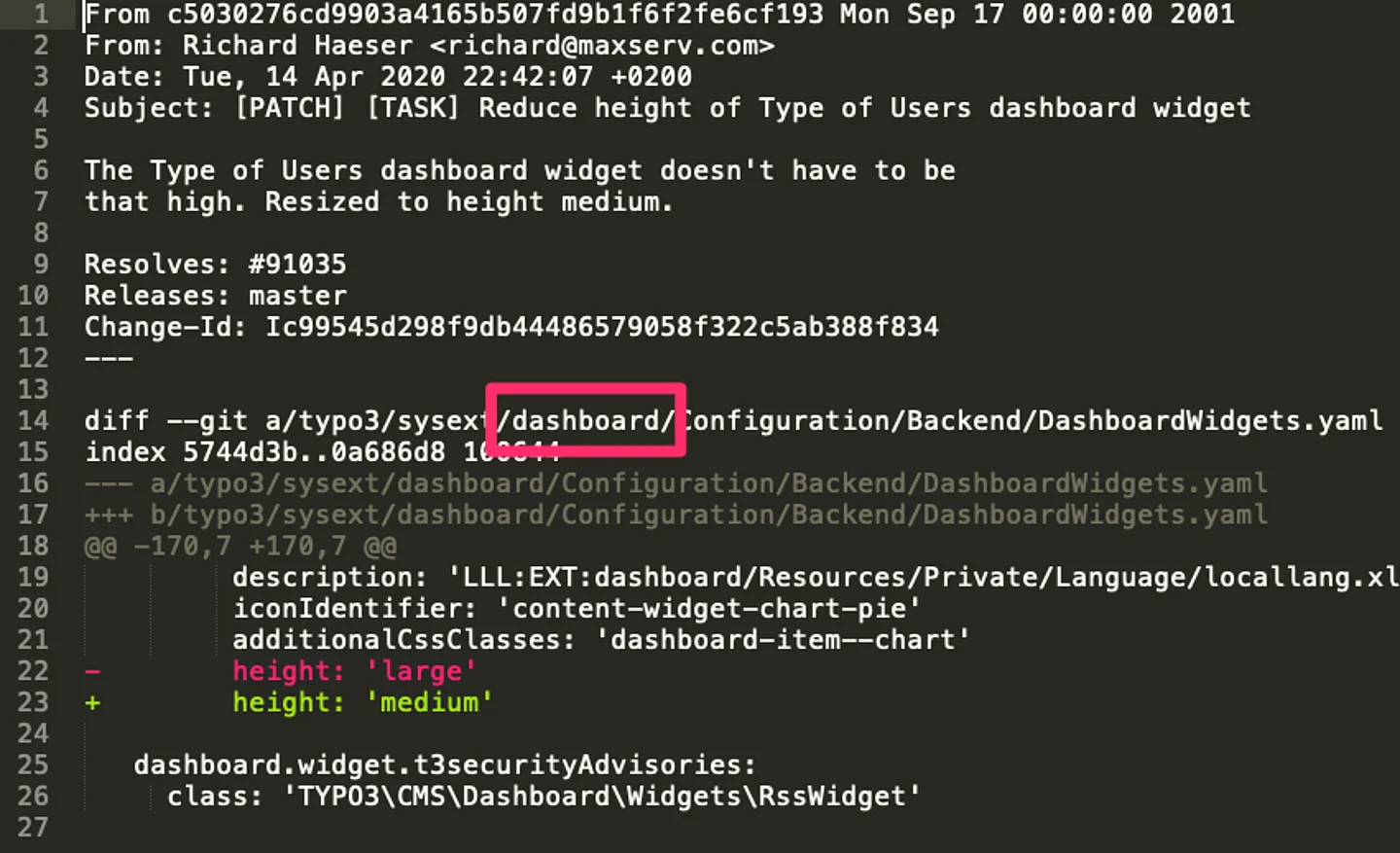 4. Open the patch file with an editor of your choice and determine which TYPO3 core package the patch is intended. Search for the typo3/sysext path. The following folder name is what we’re looking for. In this case “dashboard”.