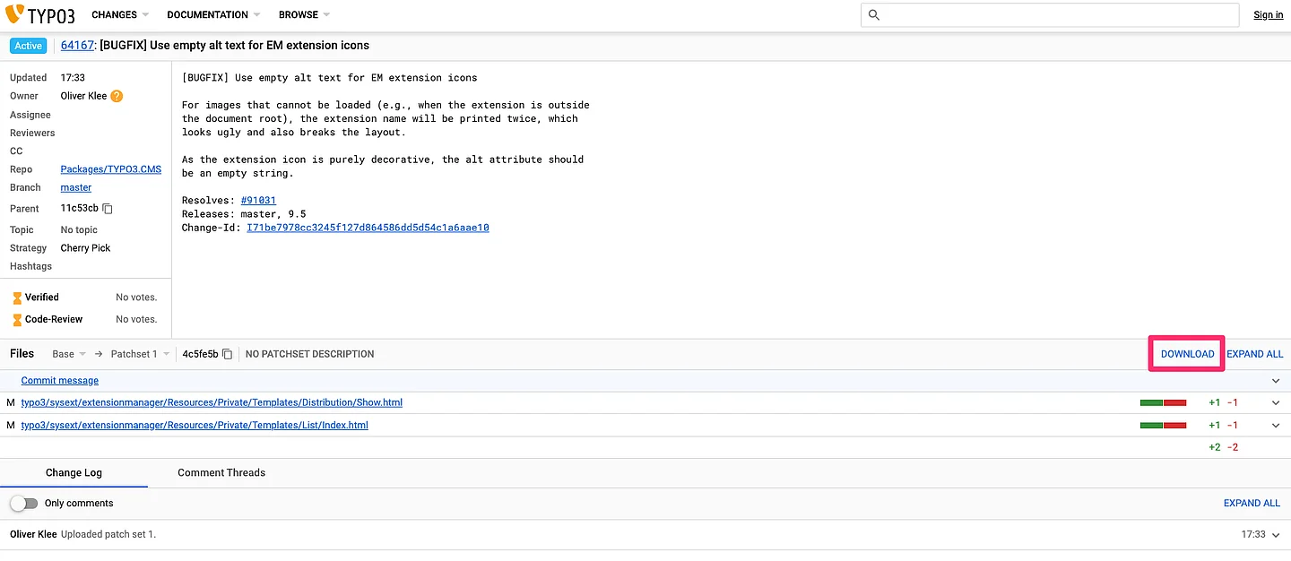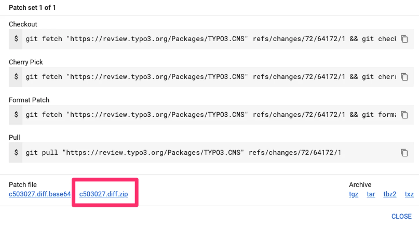 1. Pick your patch! Go to the detail page of a patch, e.g. https://review.typo3.org/c/Packages/TYPO3.CMS/+/64172