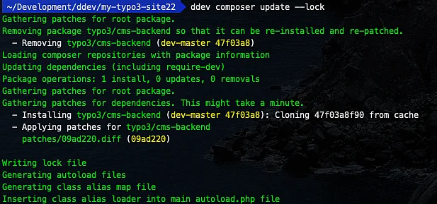 - You’re too late and the patch you’ve chosen has already been merged and thus you’ve already fetched it via “ddev composer update”.