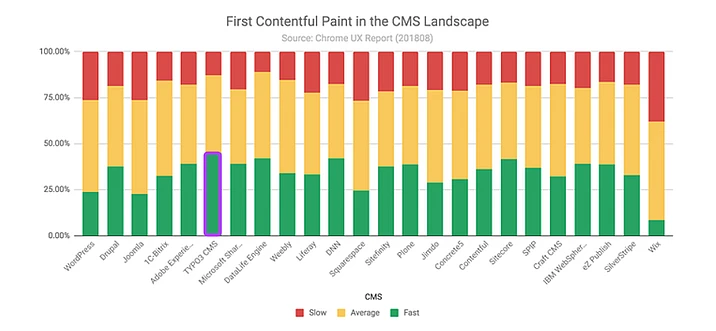 HTTP Archive is an open source project that provides data on how digital content is structured and served. In September 2018, HTTP Archive published the First Contentful Paint (FCP) scores of 24 popular content management systems, including Drupal, WordPress, Contao, and TYPO3.