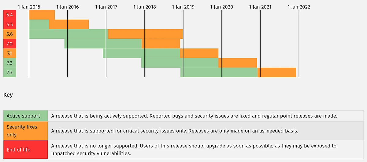 With the release of PHP 7 in 2016 came great site performance gains, it’s a huge improvement in comparison with its predecessors. PHP 7 makes your site faster. Much faster. Take a look at the image at the bottom of this page on zend.com - it shows just how fast PHP 7 is in comparison to other scripting languages like Ruby, Perl and Python - namely approximately 10 times faster! All current PHP versions are generally fully supported and patched regularly for security vulnerabilities; at the time of this writing that’s PHP 7.1, PHP 7.2 and the third feature update of the series, PHP 7.3, which was released on December 6, 2018.