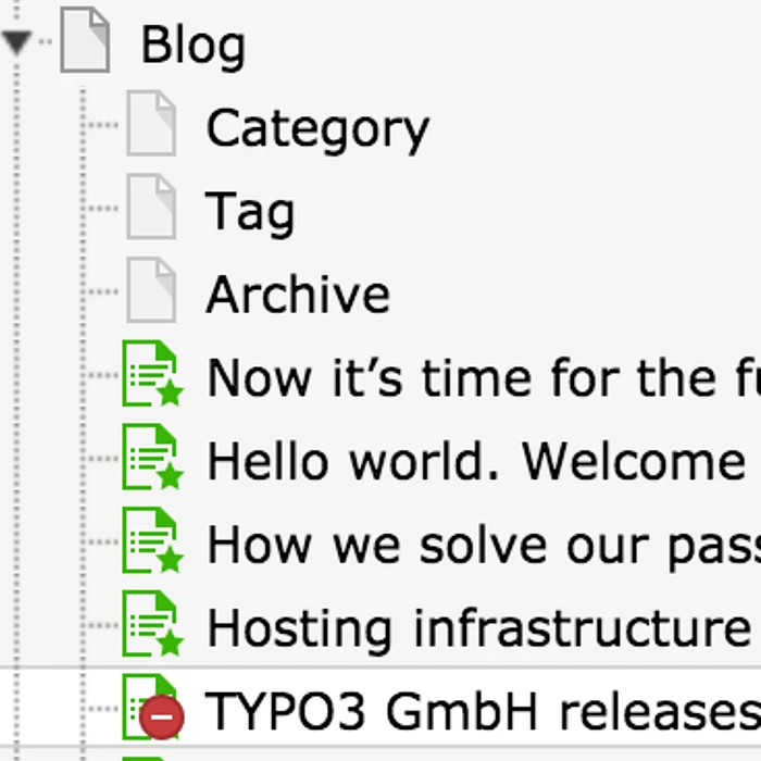 Blog entries are simply pages of a special page type blog entry and can be created and edited via the well-known page module. Creating new entries is as simple as dragging a new entry into the page tree.