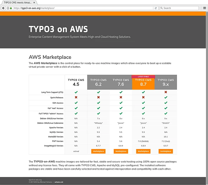 Michael Schams (schams.net) has created and maintained TYPO3 machine images for AWS since 2013. These are ready-to-use Debian GNU/Linux-based servers, tailored for fast, stable and secure web hosting using 100% open source packages without any license fees. The new TYPO3 v9 instances come with TYPO3, Apache, MariaDB and PHP 7.2 pre-configured. The installed software packages are stable and have been carefully selected and tested for interoperation and compatibility with each other.