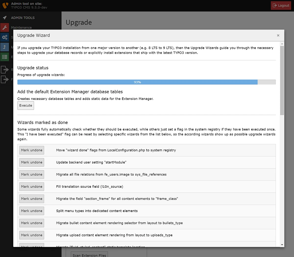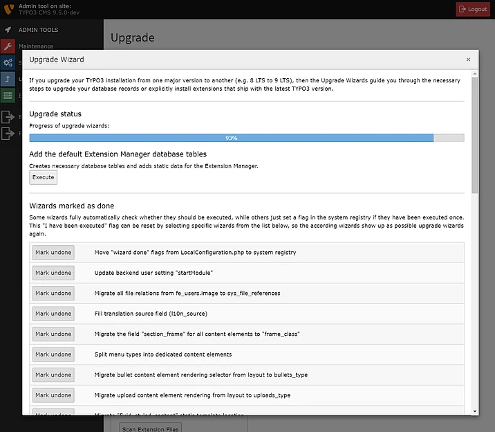 I like upgrading TYPO3 sites. It’s a straightforward process, now made even better. To start the upgrade, replace TYPO3 core and follow the steps to prepare your installation. Then go directly to the Upgrade Wizard (part of the Install Tool) by calling its URL and let it walk you through the necessary steps.