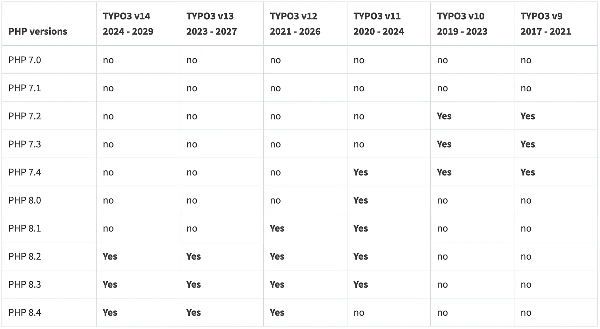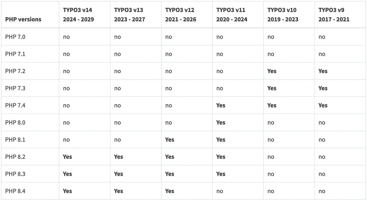 February 2025: This article is regularly updated to reflect the release cycles of both TYPO3 LTS and PHP versions.