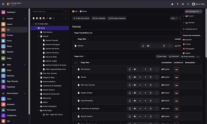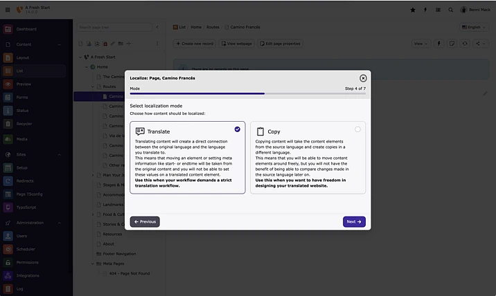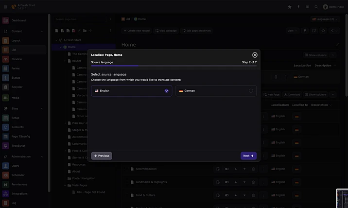 TYPO3 provides powerful tools for creating and managing multilingual websites and has long been designed around an effective translation workflow. In TYPO3 v14.0, a modernized approach replaces the previous localization system with a guided, step-based wizard that leads editors through each stage of the translation process.