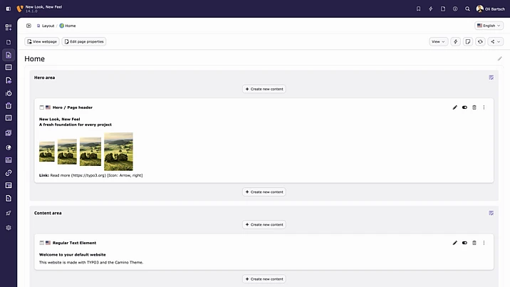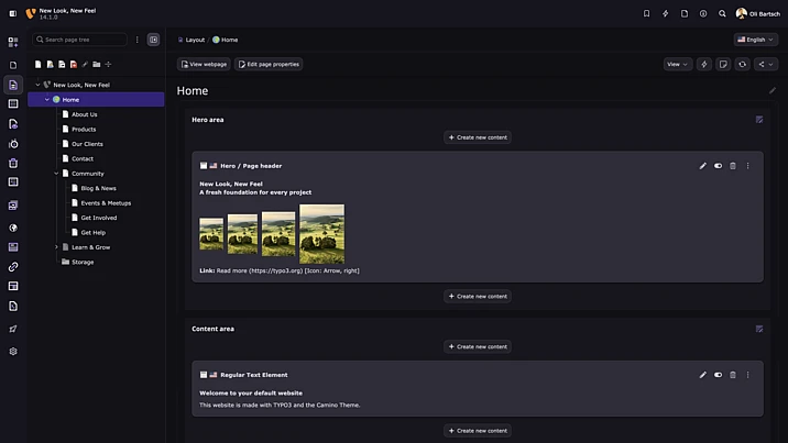 With TYPO3 v14.1, a ready-to-use default theme called Camino is now included, enabling integrators to launch new websites within minutes. The theme is fully self-contained, free of third-party dependencies, and showcases TYPO3’s standard page structure and content elements that don’t depend on Fluid Styled Content. It also offers straightforward customization options, such as multiple color schemes and configurable navigation and footer layouts.