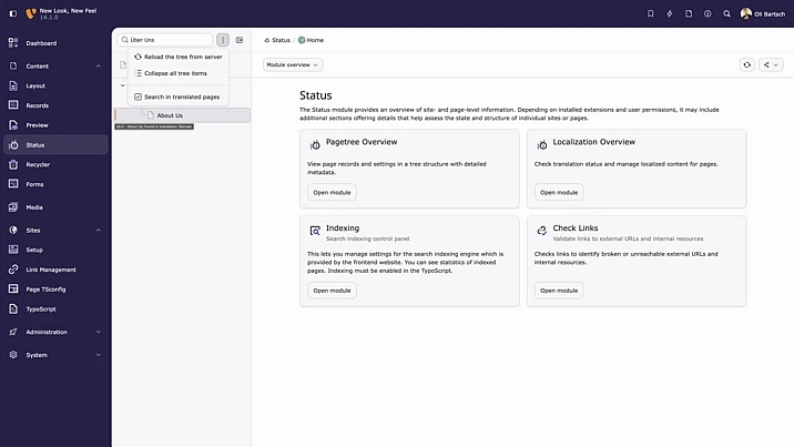 In multilingual TYPO3 installations, editors can now quickly search for pages using translated titles or translation UIDs. Visual labels highlight how each result matches the search, making it easier and more intuitive to navigate large and complex page trees.