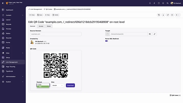 Beyond additional backend UI refinements, the sprint release also delivers a new backend module that allows editors to generate QR codes directly within the backend and link them to pages. With permanent URLs behind each code, this feature is particularly well suited for use with print materials.