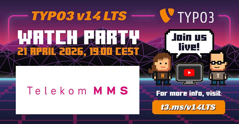 Join us for the TYPO3 v14 release party at Deutsche Telekom MMS GmbH! Let’s celebrate the latest version together in a relaxed and fun atmosphere. Make a note of 21 April 2026 at 6.00 pm (CEST) in your calendar. Look forward to great conversations, cool people and plenty of TYPO3 spirit.
