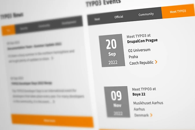 There is a new event listing at typo3.org, where all of the titles start with “Meet TYPO3 at …”. These are external events where a person representing TYPO3 will be present.